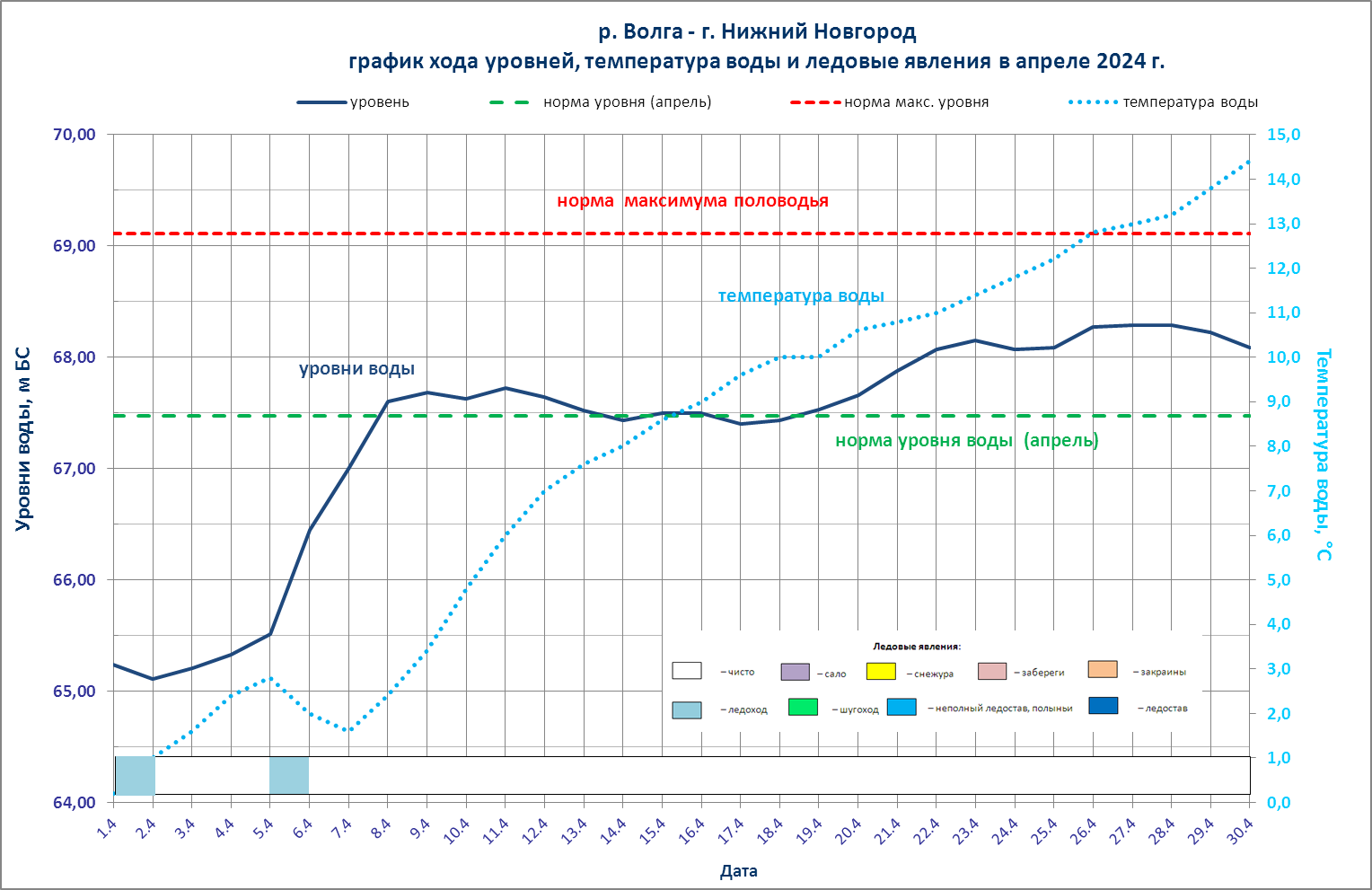 Очищение ото льда р. Волги у г. Нижнего Новгорода (Чкаловская лестница) произошло в начале апреля. Практически на протяжении всего месяца на данном участке преобладала тенденция повышения уровней воды под влиянием режима сбросов Нижегородской ГЭС и продолжавшегося подъема на р. Оке. Максимальный подъем на р. Волге у г. Нижнего Новгорода (Чкаловская лестница), наблюдавшийся 26-28 апреля, был на 0,8 м ниже нормы, по состоянию на 08.00 мск 30.04.2024 отметка уровня воды составляла 68,09 м БС, температура воды 14,4°.