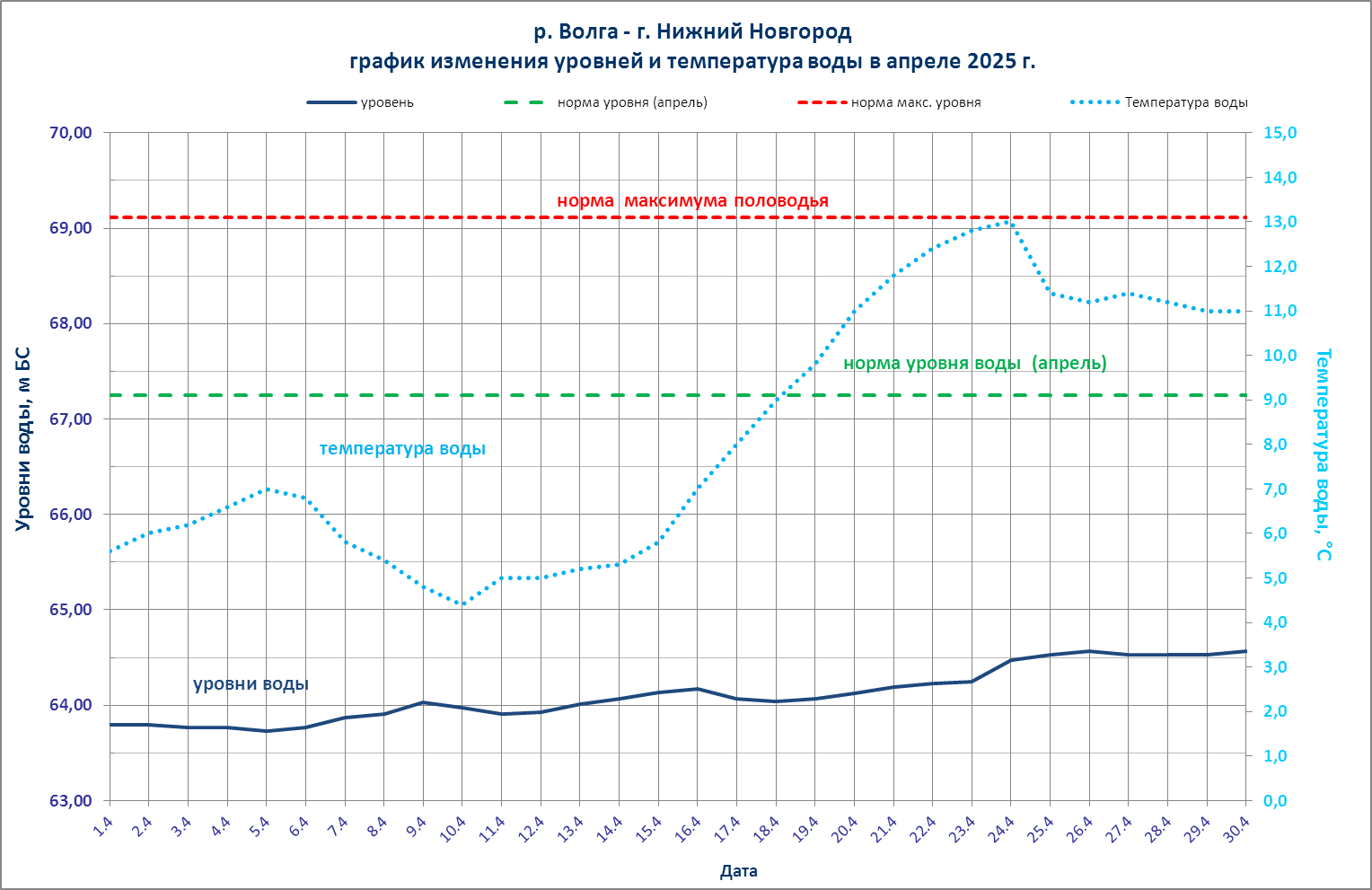 На р. Волге у г. Нижнего Новгорода (Чкаловская лестница) по состоянию на 08.00 мск 30.04.2025 отметка уровня воды составляла 64,57 м БС, температура воды 11,0°.