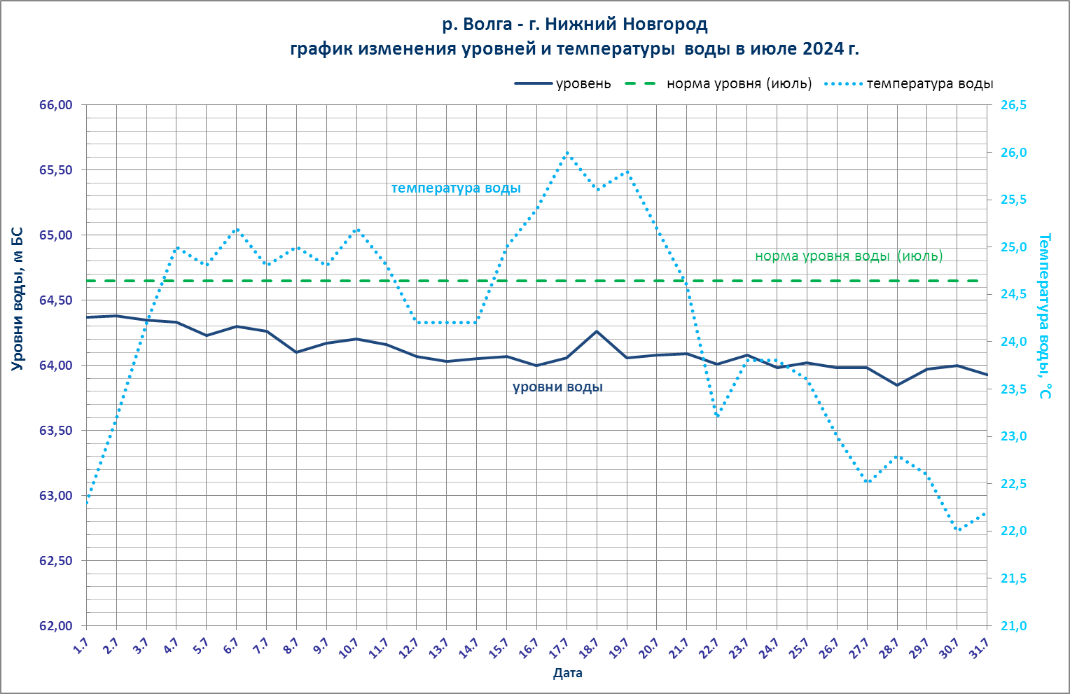 По состоянию на 08.00 мск 31.07.2024 отметка уровня воды на р. Волге у г. Нижнего Новгорода (Чкаловская лестница) составляла 63,93 м БС, температура воды 22,2