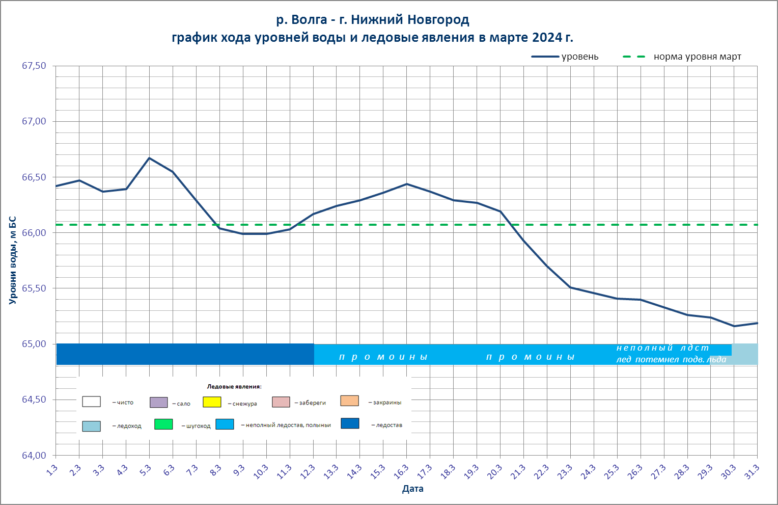 На большинстве рек, Горьковском и Чебоксарском водохранилище (за исключением приплотинной части) до 20 марта сохранялся ледостав, ледостав с полыньями, в третьей декаде марта появились промоины, закраины, вода на льду, лед потемнел.