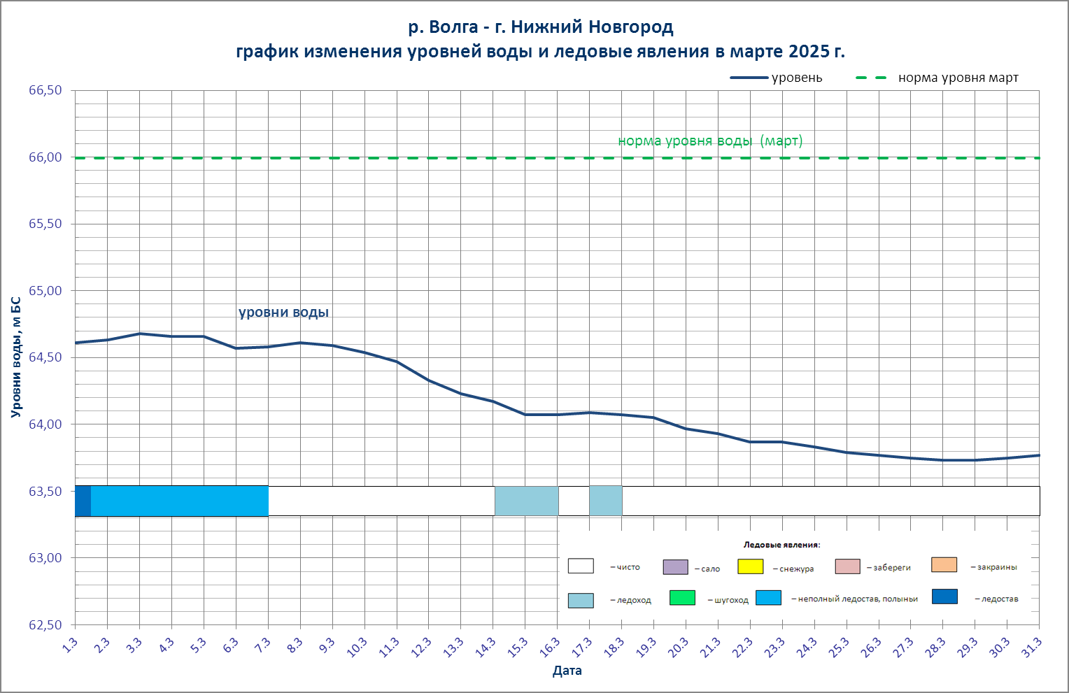 На р. Волге у г. Нижнего Новгорода (Чкаловская лестница) по состоянию на 08.00 мск 31.03.2025 отметка уровня воды составляла 63,77 м БС, температура воды 5,2°. Ледостав на данном участке разрушился 8 марта, в период 15-18 марта, после вскрытия р. Оки, отмечался вторичный ледоход.