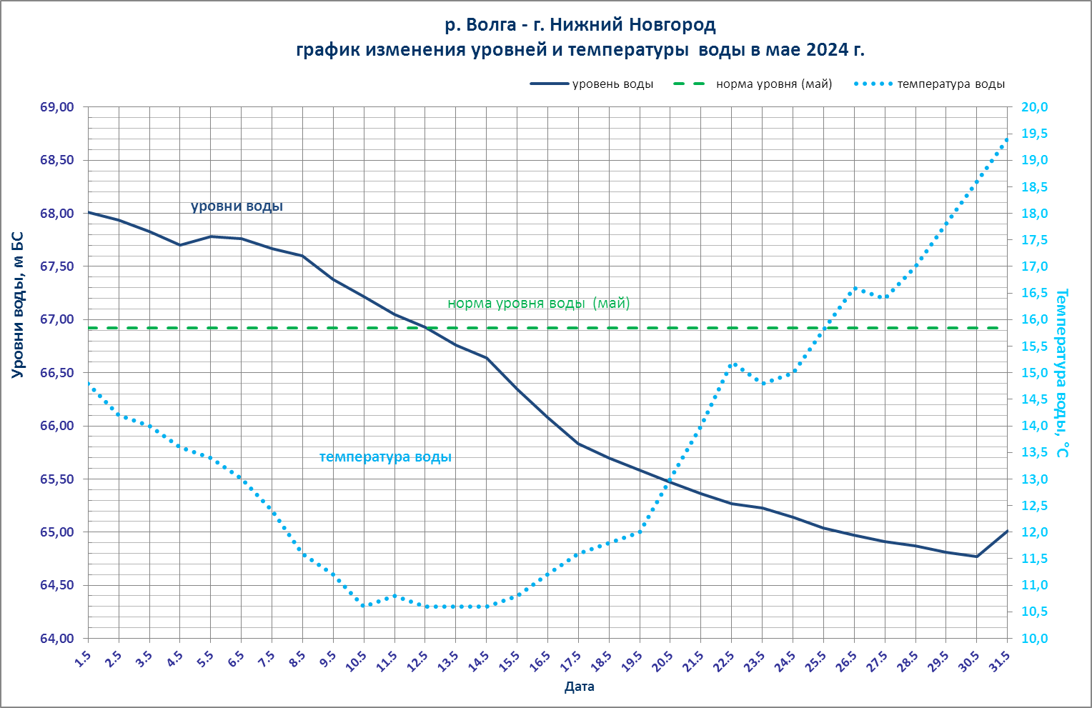 По состоянию на 08.00 мск 31.05.2024 отметка уровня воды на р. Волге у г. Нижнего Новгорода (Чкаловская лестница) составляла 65,01 м БС, температура воды 19,4°.
