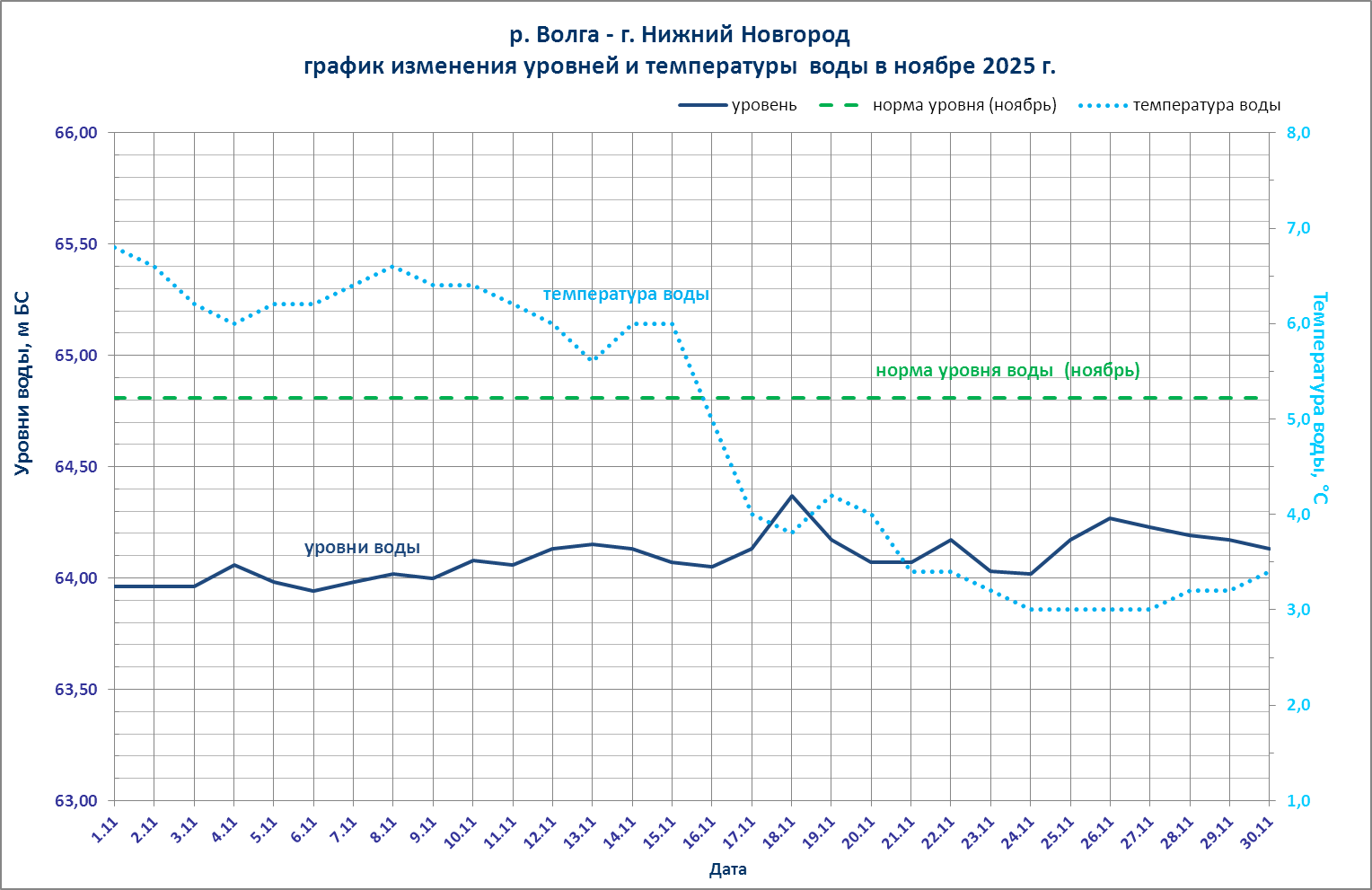 На р. Волге у г. Нижнего Новгорода (Чкаловская лестница) по состоянию на 08.00 мск 30.11.2025 отметка уровня воды составляла 64,13 м БС, температура воды 3,4°.