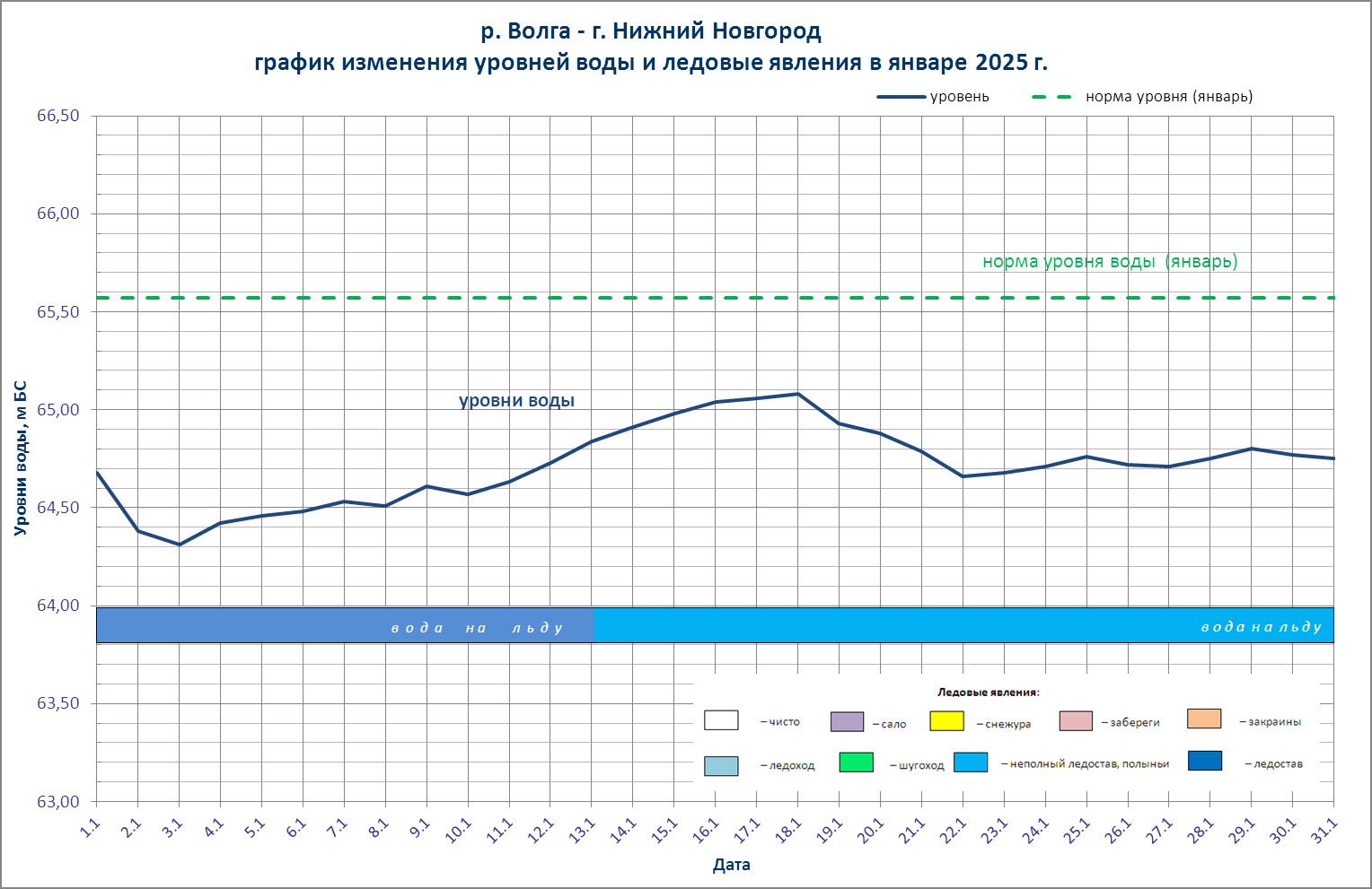 По состоянию на 08.00 мск 31.01.2025 отметка уровня воды на р. Волге у г. Нижнего Новгорода (Чкаловская лестница) составляла 64,75 м БС, наблюдался неполный ледостав.