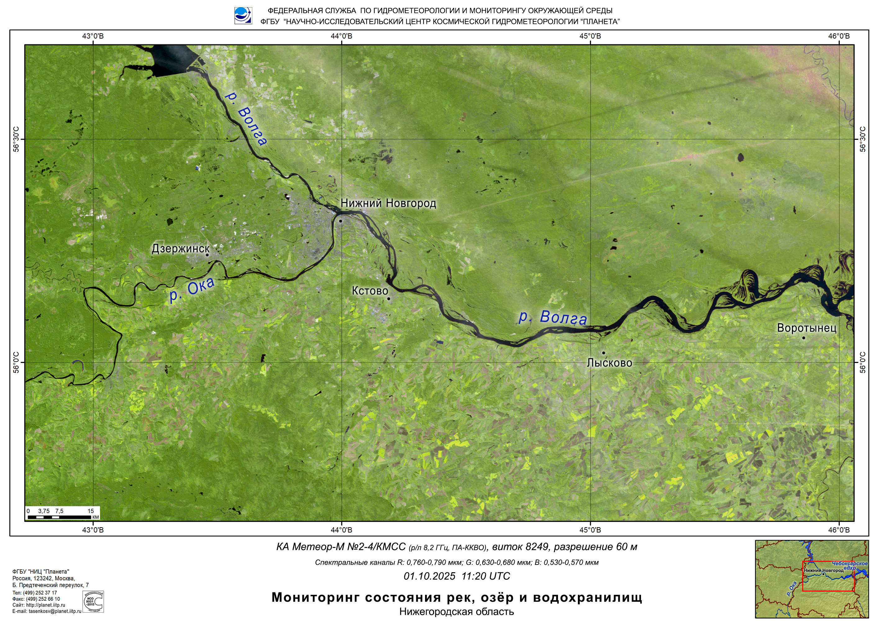 НИЦ «Планета» Росгидромета регулярно (3-4 раза в неделю) проводит мониторинг гидрологической обстановки рек, озер и водохранилищ России, последний из представленных снимков Горьковского вдхр. сделан 01.10.2025г. Цветения не выявлено.