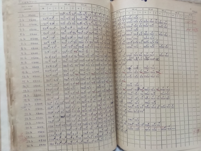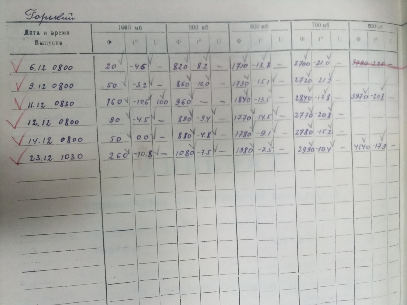 Первое зондирование атмосферы состоялось на территории Ворошиловского района г. Горького (ныне территория АЭ Нижний Новгород, Приокский район г. Нижнего Новгорода) в декабре 1943 года. В архивах фонда данных Гидрометцентра ФГБУ «Верхне-Волжское УГМС сохранились отчеты тех военных лет. В таблицах ТАЭ-8 указаны фамилии первых сотрудников, производящих зондирование атмосферы: Солопов А.В., Яблокова М.В., Рождественская З.Н., Сергеев В.В. Старшим инженером отдела аэрологии в тот период был А.И. Щелоков. В декабре 1943 года было произведено только 6 выпусков радиозондов, (полмесяца радиозонды не выпускались, также многие подъемы были забракованы). Высота подъема была всего 4 км. В таблицах результатов температурного зондирования ТАЭ-7 видно, что спустя 3 года в 1946 году высота полета увеличились до 12 км.