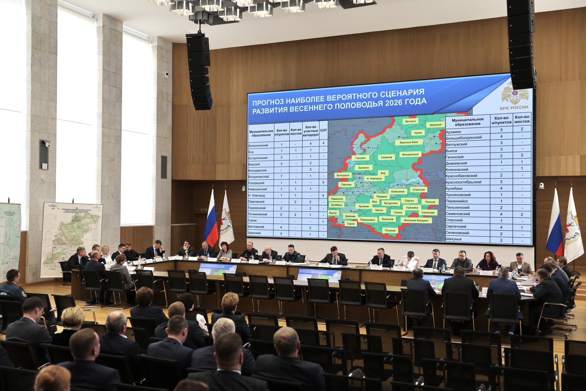 20 марта 2026 г. в Нижегородском кремле губернатор Нижегородской области Глеб Никитин провел заседание комиссии по предупреждению и ликвидации чрезвычайных ситуаций и обеспечению пожарной безопасности (КЧС). На заседании были рассмотрены вопросы безаварийного прохождения весеннего половодья, а также изучен прогноз развития пожароопасной обстановки в весенне-летний период.